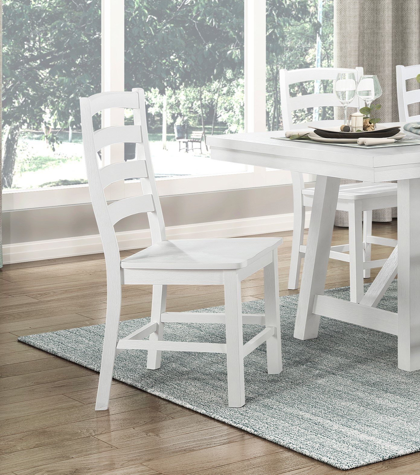 Description & DimensionsSeating six, the Redmond Collection's design is inspired by the casual farmhouse movement, utilizing unfettered lines, and natural texture to create this charming dining group. The wood side chair's classic profile pairs with the modified A-frame picnic table base, culminating in a casual style solidifies your desired farmhouse aesthetic. The distinct grain of the collection's oak veneer is highlighted by the available black or white finish.PRODUCT DIMENSIONS: DINING TABLE: 38" x 72" x 30.5"HApron to floor: 27"Distance between legs from the shorter side: 21"Distance between legs from the longer side: 45.5"SIDE CHAIR: 18" x 21.5" x 38.5"HSeat Width: 18"Seat Depth: 18"Seat Height: 18"Listing Includes: 7pc Dining Set (1 Table and 6 Side Chairs Only.Simple Assembly Require.
